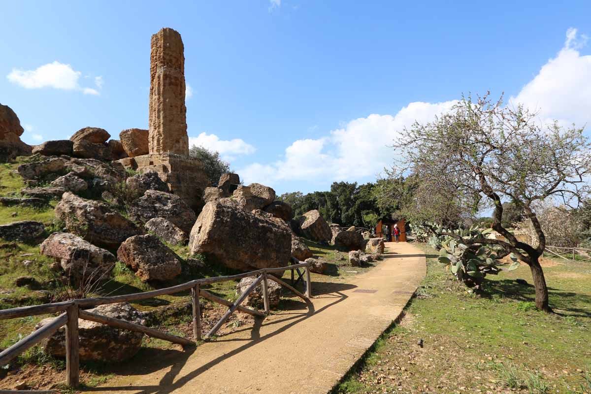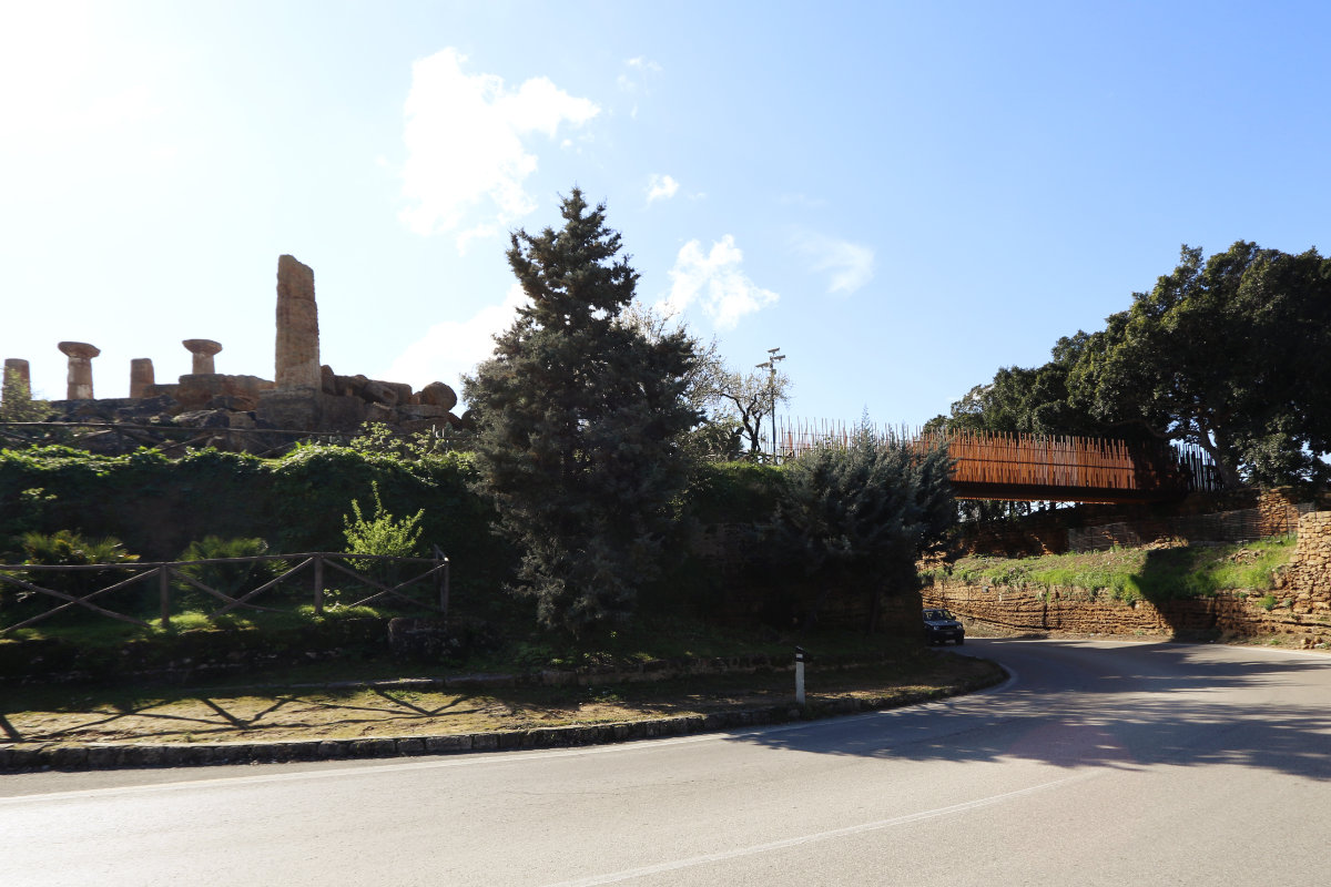 L’aspetto romantico delle rovine, il concetto di non finito cui queste rimandano, le operazioni di restauro per anastilosi compiute nel corso del tempo, hanno portato ad un’immagine della Valle dei Templi caratterizzata da elementi di diverse altezze e dimensione, creando differenti moduli espressivi e formali. Le differenti altezze delle colonne del vicino tempio di Eracle sono state trasfigurate e reinterpretate progettualmente nella passerella, in una sequenza dinamica di barre verticali di diverse altezze, che generano una vibrazione della luce, producendo un effetto di trasparenza e di smaterializzazione.