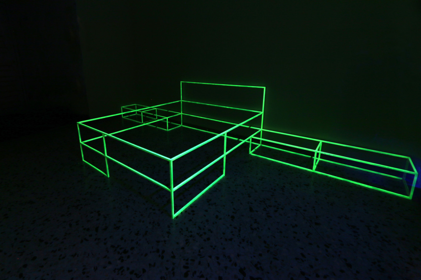 Il progetto è composto da strutture metalliche che delineano gli arredi di una stanza da letto,