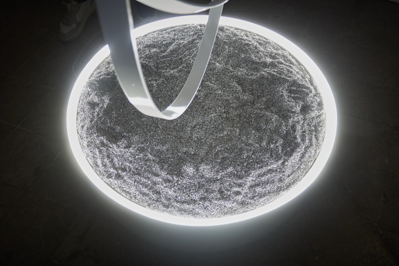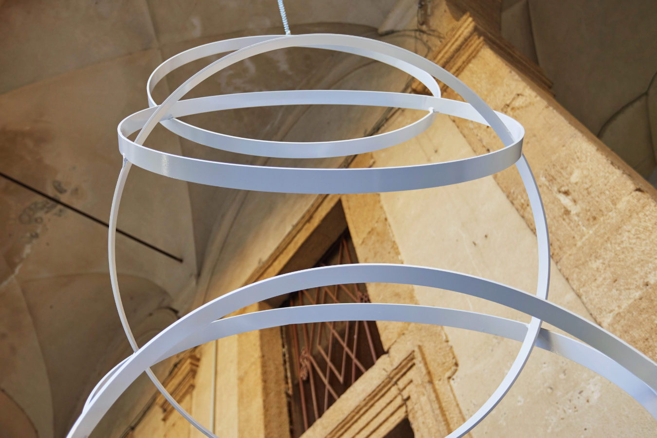 L’opera è concepita per essere vista all’interno di uno spazio che ne permetta l’osservazione a 360 gradi. La vista frontale, che rivela gli anelli, si trasforma gradualmente fino a farli apparire come segmenti nella visione laterale.