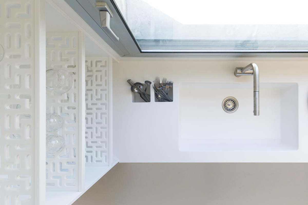 La finalità della massima ergonomia e funzionalità delle attività culinarie si riflette nell’ampio spazio di lavoro continuo e monomaterico che si sviluppa ad elle ed è corredato da soluzioni specifiche per lo scolapiatti, lo scolaposate e il portaspezie. Sul lato opposto, a definire lo spazio cucina, vi è un mobile con cassetti dove è prevista una soluzione a bar con sgabelli dalla parte esterna.