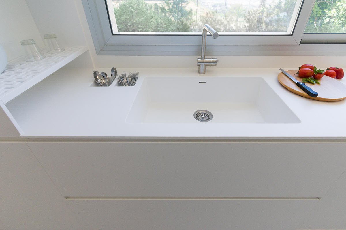 Per le superfici a vista, è stato scelto il Solid Surface LG Hi-Macs, un materiale che ha risposto perfettamente alle necessità funzionali (durevolezza, igiene, resistenza all’acqua) e estetiche (omogeneità, continuità materica, levigatezza e purezza del colore).