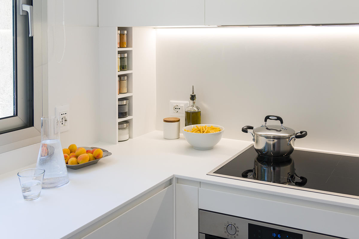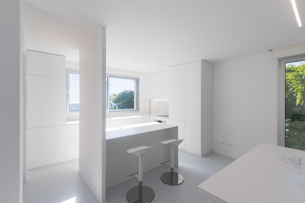 Il progetto della cucina minimal si inserisce all'interno di una ristrutturazione, con l'obiettivo di creare una continuità armoniosa con l'ambiente living. Questo ha offerto l'opportunità di risolvere alcune problematiche spaziali e funzionali. La prima riguarda l’occultamento delle sporgenze dei pilastri strutturali, che sono stati integrati all’interno dei mobili. La seconda riguarda la gestione della circolazione, in particolare l’ingresso al living, posto sul lato stretto della cucina. Questa esigenza è stata affrontata con l'inserimento di un setto verticale, che definisce in modo chiaro i percorsi e la funzionalità dello spazio.
